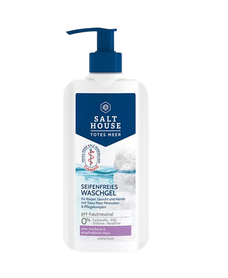 Erleben Sie die sanfte Reinigung mit dem SALTHOUSE Totes Meer Therapie Seifenfreien Waschgel - ein vielseitiges Produkt für Körper, Gesicht und Hände.